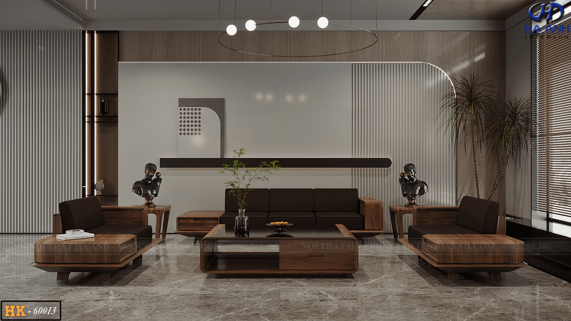 Mặt bằng bộ sofa gỗ óc chó tự nhiên HK 60012
