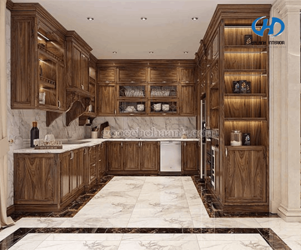 Hầu hết ai cũng thích những đồ nội thất bền đẹp, cao cấp và tạo được sự sang trọng cho ngôi nhà. Chính vì điều này mà rất nhiều người lựa chọn sử dụng gỗ tự nhiên cho nội thất nhà bếp. Đặc biệt là loại gỗ óc chó, do gỗ óc chó có màu khá đẹp, vân rõ nét, mịn và bóng, tạo được sự sang trọng, đẳng cấp cho ngôi nhà.